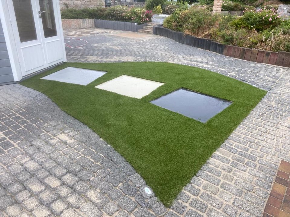 Die Kombination aus diesen tollen Trittplatten und dem Kunstrasen ist einfach Traumhaft, auch wenn sich die Sonne auf den Bilder nicht zeigt.